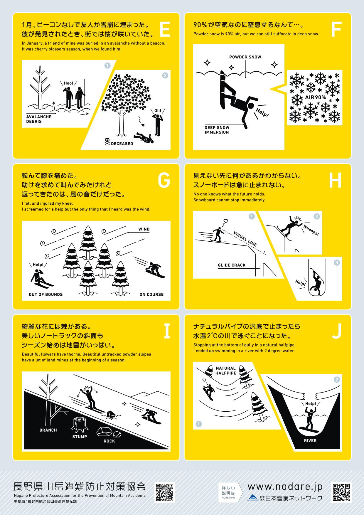 7 近年バックカントリーにおける立ち木への衝突や雪崩による事故が多発しています。必ず経験者もしくはガイドと共に行動してください。